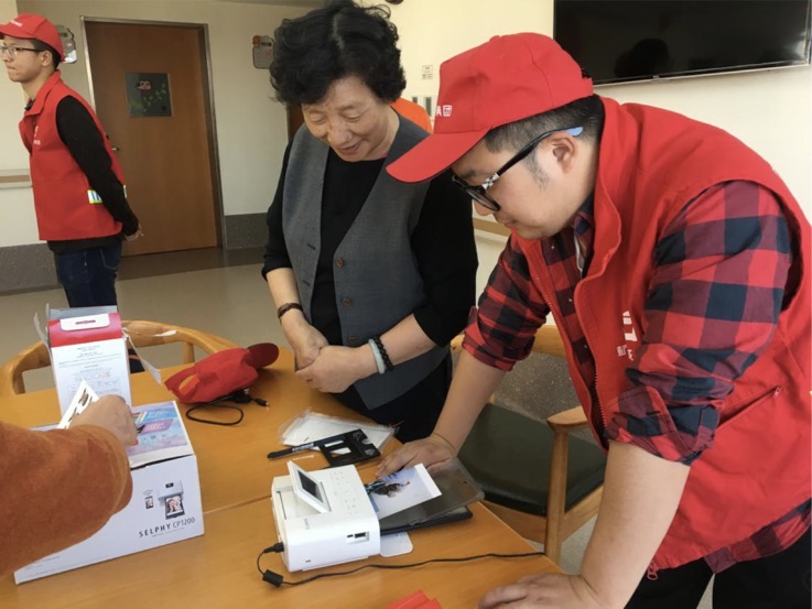 大家为老人们拍摄照片,并现场打印送给老人。敬老院的老人们大多腿脚不便,已经很久没有拍过照。看到新鲜出炉的照片,老人们很是惊喜,纷纷换上漂亮的衣服前来拍照,也和志愿者们聊起了家常,平日清静的庭院满是欢声笑语。