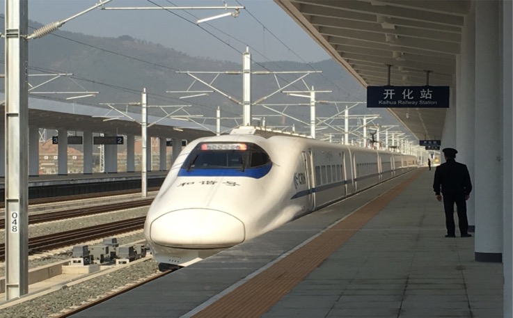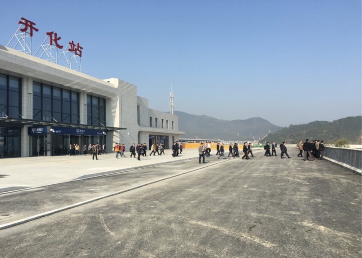 今天上午8点40分,和谐号动车组试验列车到达新建衢九铁路开化火车站。中国铁路总公司建设部主任王峰、副主任鞠国江一行调研开化火车站项目,上海铁路局李英九副局长等陪同调研。在项目施工现场,各位领导查看了进站匝道桥、落客平台、站前广场的建设情况,并对广场的空间功能划分、景观绿化设计、旅客通行组织以及周边交通设施等进行询问,项目公司现场解答。