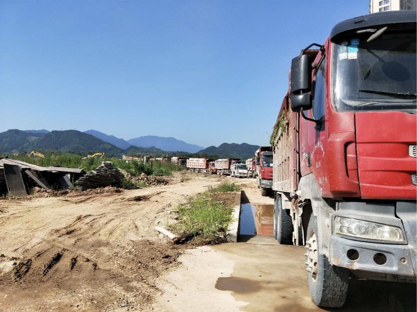 项目部管理人员冒着酷暑安排运土车辆避开交通高峰期,争分夺秒保证工程施工顺利进行。