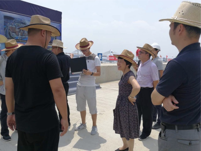 在现场水投公司南主任向调研组一行介绍了海塘工程基本概况、当前的工程进度以及建成后对鹿城区西片大区块开发建设的带动效益。随后胡亚萍副主任与现场陪同人员亲切交谈,对整个项目的建设情况给予充分的肯定。